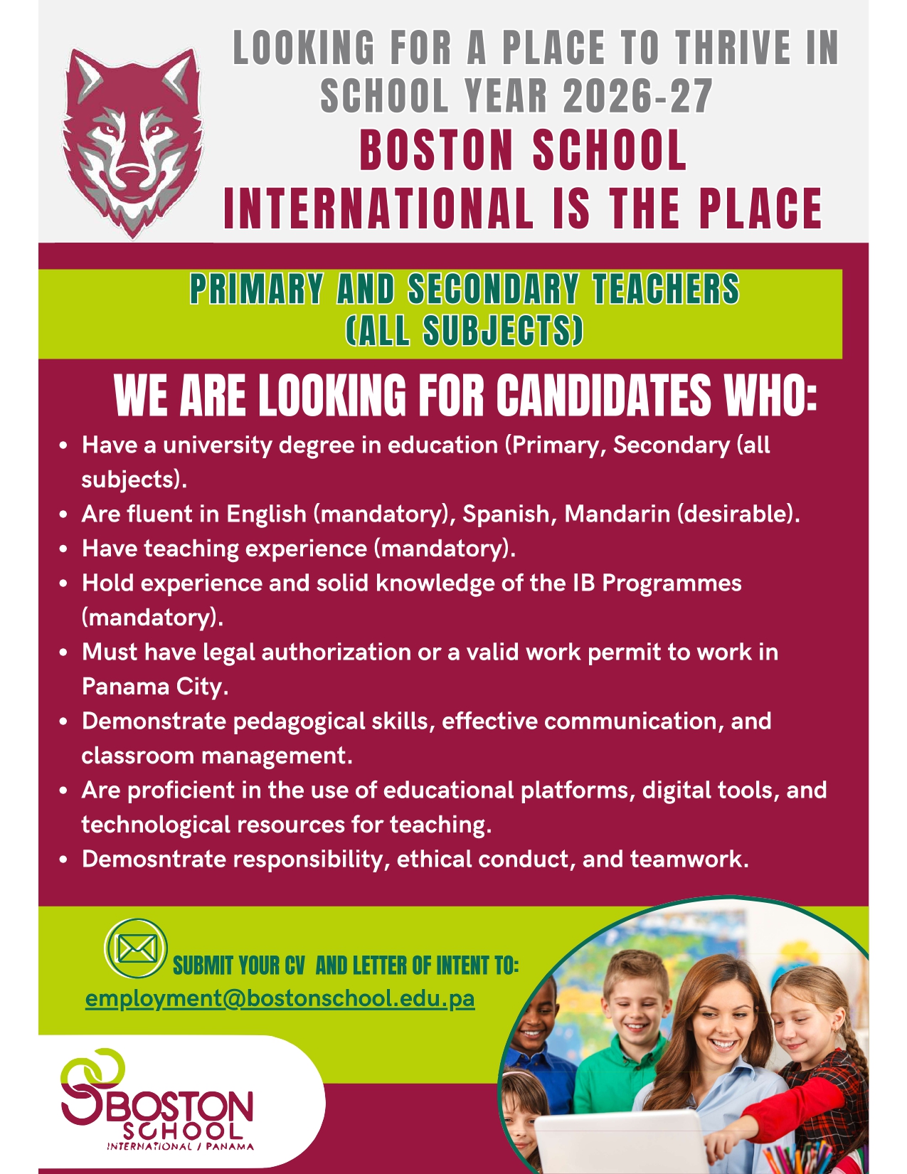 Oportunidades de empleo Oportunidades de empleo Si estás interesado en postular a alguno de estos puestos por favor envía tu CV a: employment@bostonschool.edu.pa